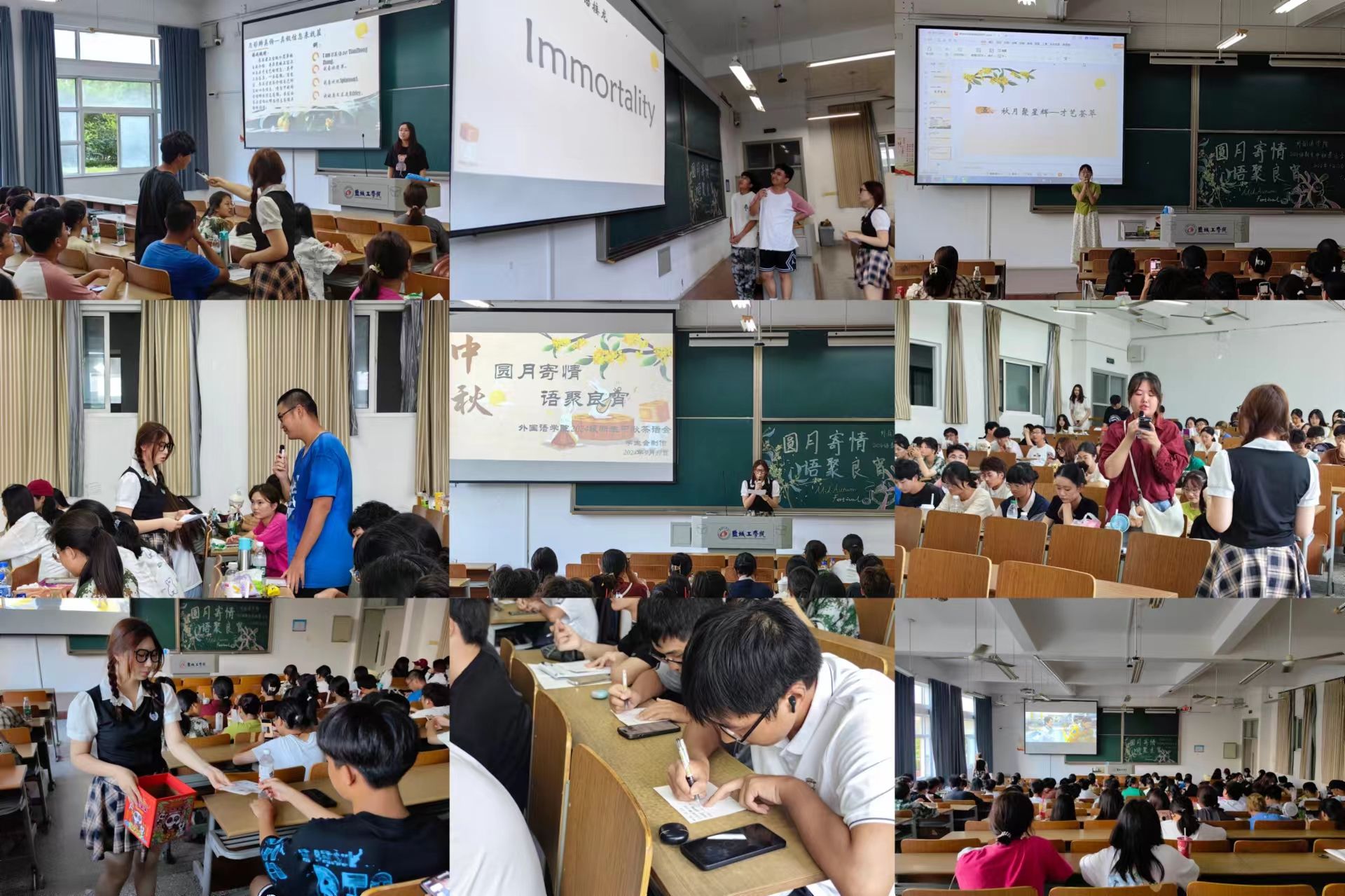 活动在温馨的氛围中拉开帷幕。此次活动分为六个环节:“明月启佳话”外语诗歌、名言分享、“星月竞词汇”外语接龙游戏、“月影辨真伪”自我介绍、“嘉月传心语”祝福分享时刻、以及“秋月聚星辉”才艺荟萃环节。文体部部长刘欢颜作为主持人首先以流利的英语和日语开场,向新生们致以中秋佳节的诚挚祝福。在后续的环节中,同学们积极踊跃参加,欢笑与掌声交织。最后,大家一起观看《独行月球》。在轻松幽默的氛围中,此次茶话会落下帷幕。这次茶话会不仅宣传了中国传统节日——中秋节,还为新生提供了加深彼此认识和了解的平台。大家以才艺展现自我风采,为茶话会增添了一抹亮丽的色彩。