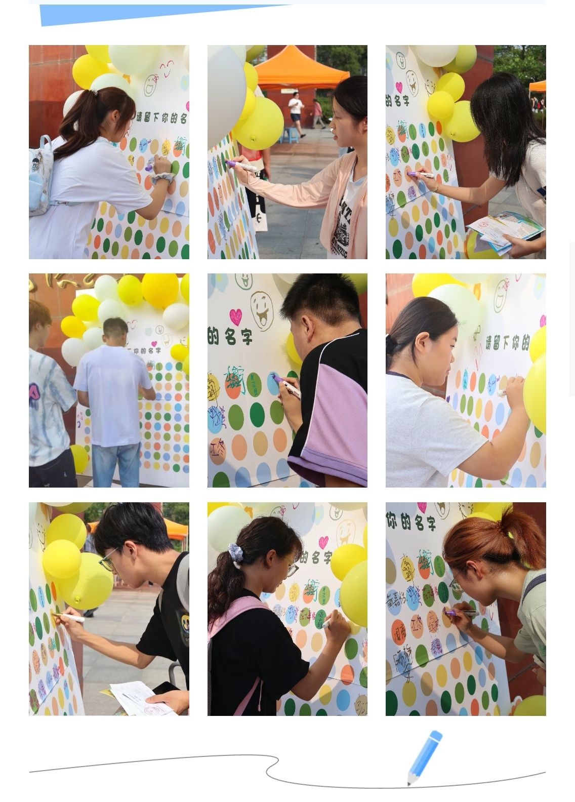 今年的迎新活动是多彩签名板,学长学姐用涂鸦、气球装点签名版,签名版前人头攒动,新生们纷纷用中、日、英等语言写下自己的名字,留下了在william威廉亚洲官方的第一个珍贵印记。