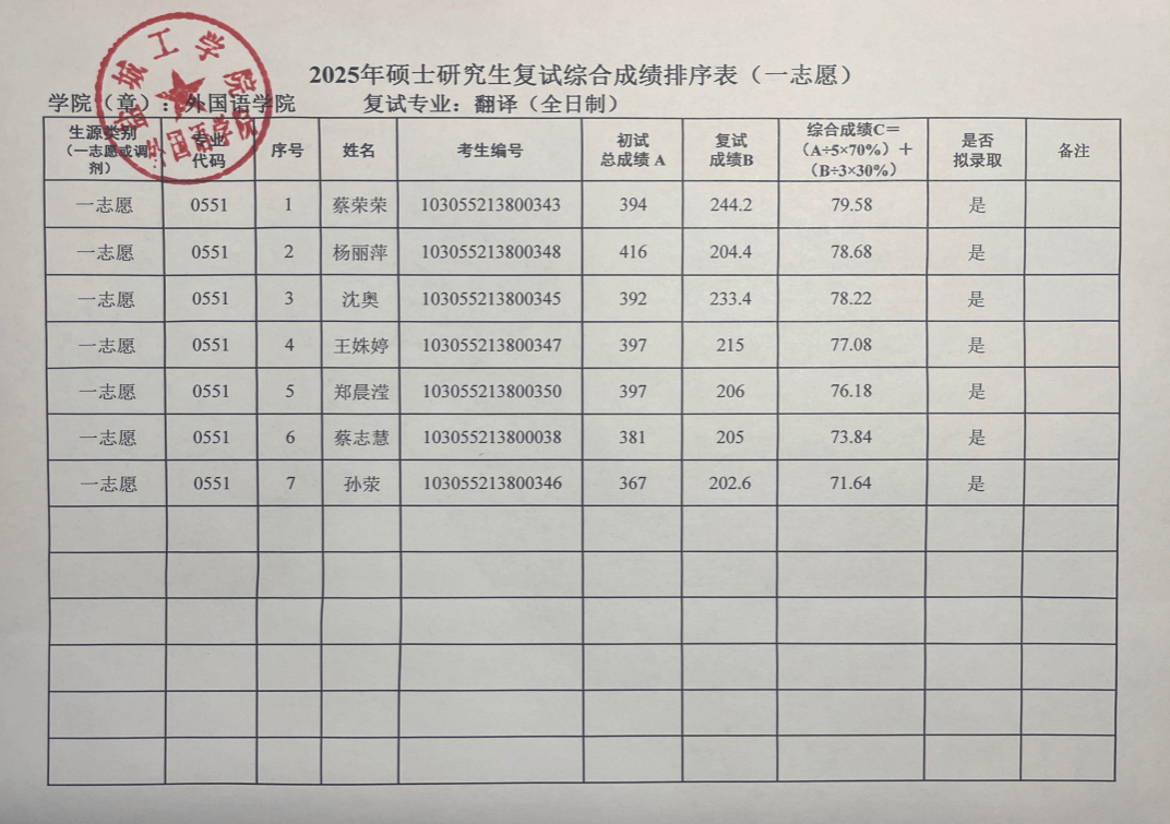 2025年硕士研究生复试综合成绩排序表(一志愿)