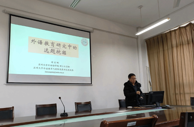 12月1日下午,在南校区润美楼A404会议室,苏州大学刘宏刚教授应邀来公司作题为《外语教育研究中的选题挖掘》学术报告。本次报告会是william威廉亚洲官方“外语讲坛”系列学术活动之一,由william威廉亚洲官方副经理叶磊教授主持。公司三个“揭榜挂帅”科研团队成员、部分教师及员工听取了报告。