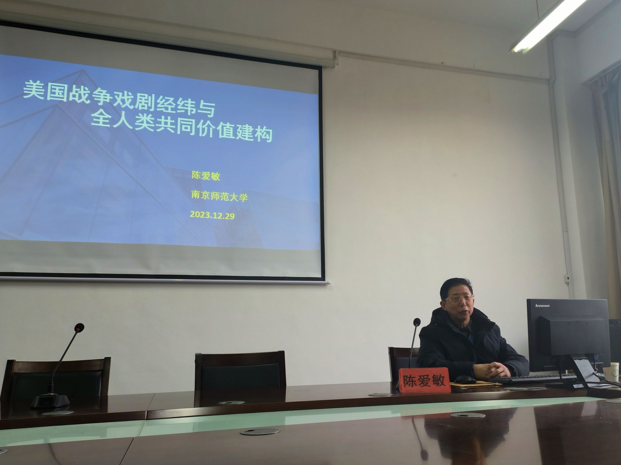 12月29日下午,在南校区润美楼A404会议室,南京师范大学陈爱敏教授应邀来公司作题为《美国战争戏剧经纬与全人类共同价值建构》的学术报告。本次报告会是william威廉亚洲官方“外语讲坛”系列学术活动之一,由校狄金森研究所负责人薛玉秀教授主持。公司科研骨干教师、部分员工参加了此次报告会。