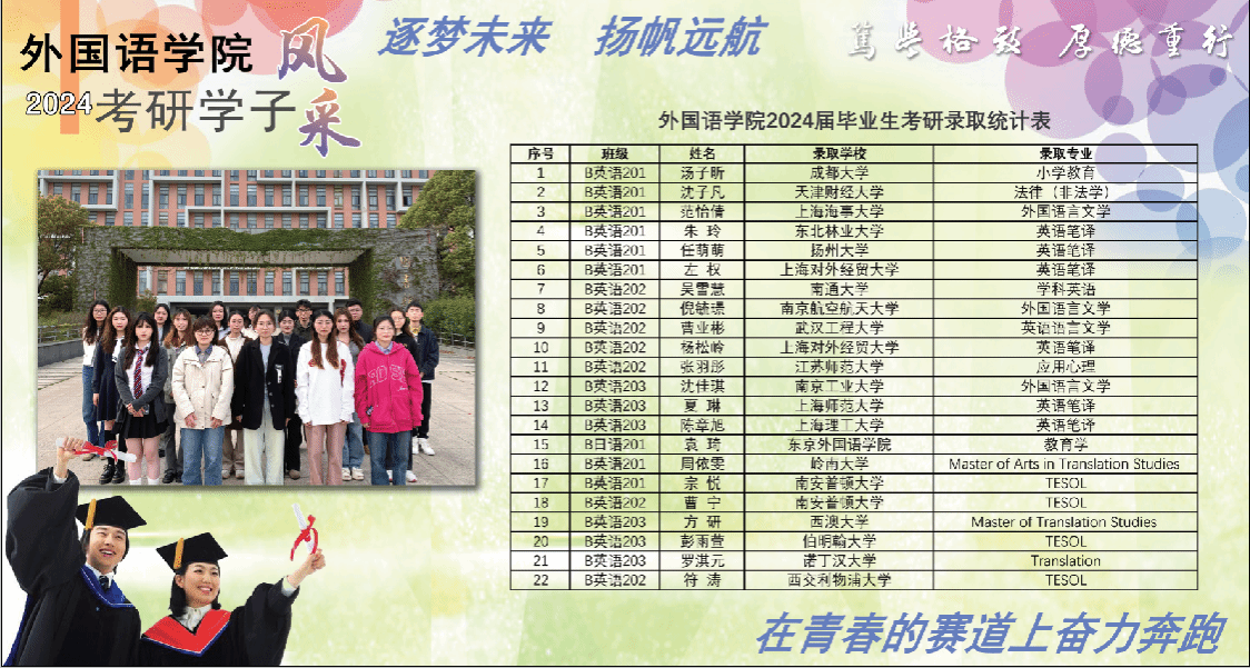 在全院师生的共同努力下,2024届137名毕业生中有22名同学分别被南京航空航天大学、东北林业大学、成都大学、上海对外经贸大学、伯明翰大学等国内知名高校录取,考研率达16.05%。