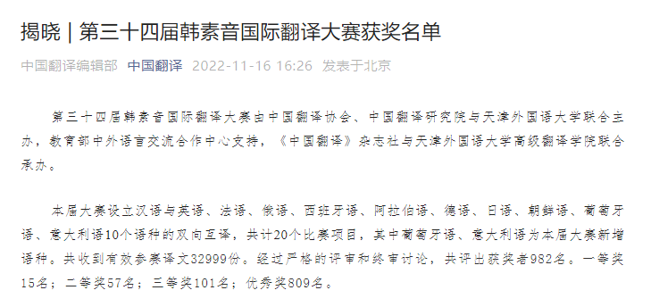 近日,第34届韩素音国际翻译大赛获奖名单正式揭晓。本届大赛由中国翻译协会、中国翻译研究院与天津外国语大学联合主办,教育部中外语言交流合作中心支持,《中国翻译》杂志社与天津外国语大学高级翻译公司联合承办。比赛共收到有效参赛译文32999份。经过严格评审和终审讨论,共评出获奖者982名。