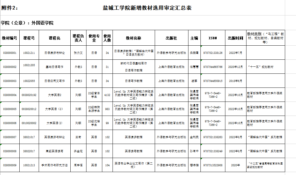 现将通过的春学期教材审查的,公司新增的10本教材进行公示,若有异议请在2022年12月5日前与外院教科研办公室联系 (联系人:张老师 电话:8816-8850)。