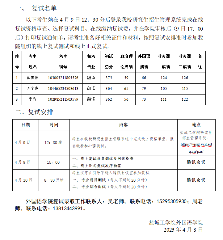 2025年硕士研究生复试名单及复试安排 (调剂一批次)