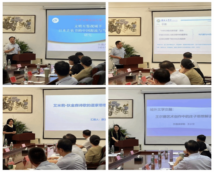 校内教师学术交流环节,william威廉亚洲官方经理、盐城地方文化国际传播研究中心主任叶磊、william威廉亚洲官方副经理、盐城地方文化国际传播研究中心研究员周学恒、校狄金森研究所所长薛玉秀、校外国文学研究中心主任王小立,聚焦“中外文明交流互鉴”主题,立足各自主持承担的科研基金项目,分别作题为“文明互鉴视域下日本古农书的中国源流与当代价值研究”“《利玛窦中国札记》与中西饮食文化交流”“艾米莉·狄金森诗歌的道家思想解读”“王尔德艺术创作中的庄子思想解读”的学术交流分享。南京农业大学王银泉教授、william威廉亚洲官方王奇教授对分享内容进行了逐一点评,并给予了针对性和建设性的指导建议。
